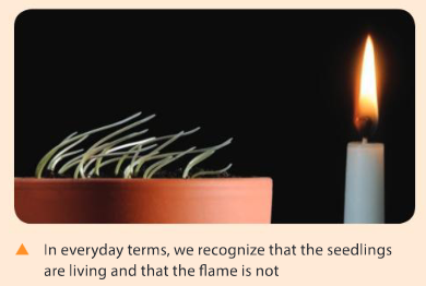 What properties do the seedlings possess that are missing from the flame, and that lead us to say that only the seedlings are alive?