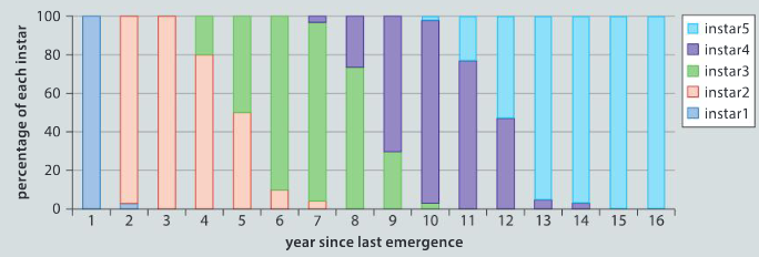 life known as instars. At the end of each instar period, it sheds its outer skin. The fifth instar emerges from underground and sheds its skin to become the short lived adult. At the point of the emergence, a burst in the adult population above ground occurs. The graph shows the percentage of underground nymphs that are in each stage. Using the information in the graph, answer the