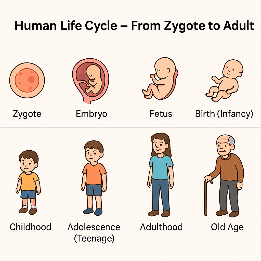 - Human life starts as a zygote and continues through stages: embryo, fetus, infant, child, teen, adult, old age.