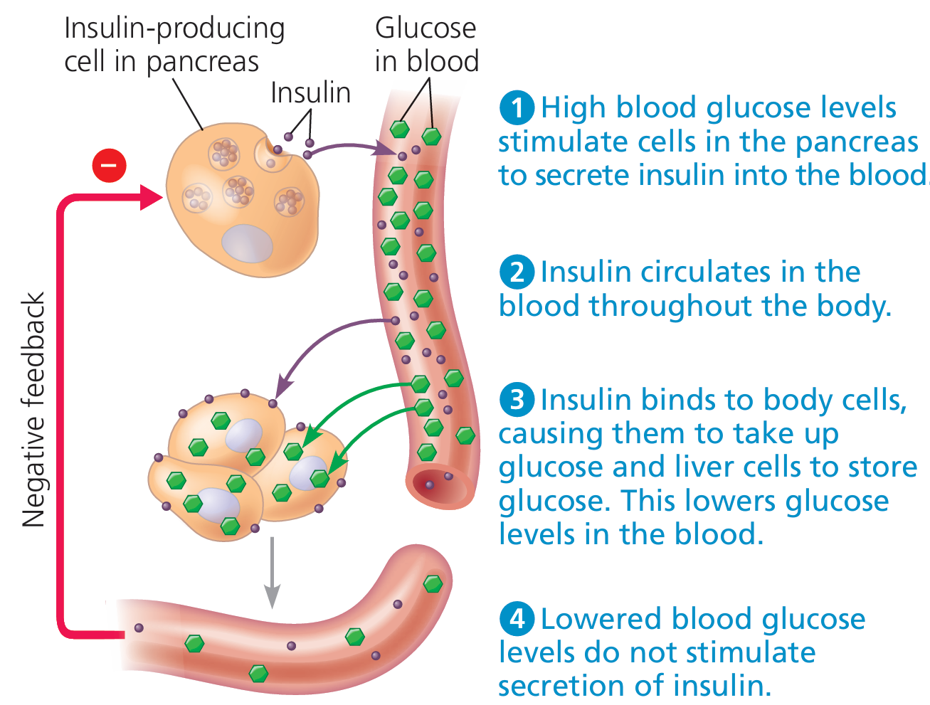 - Response: Liver and muscles absorb glucose → blood glucose returns to normal