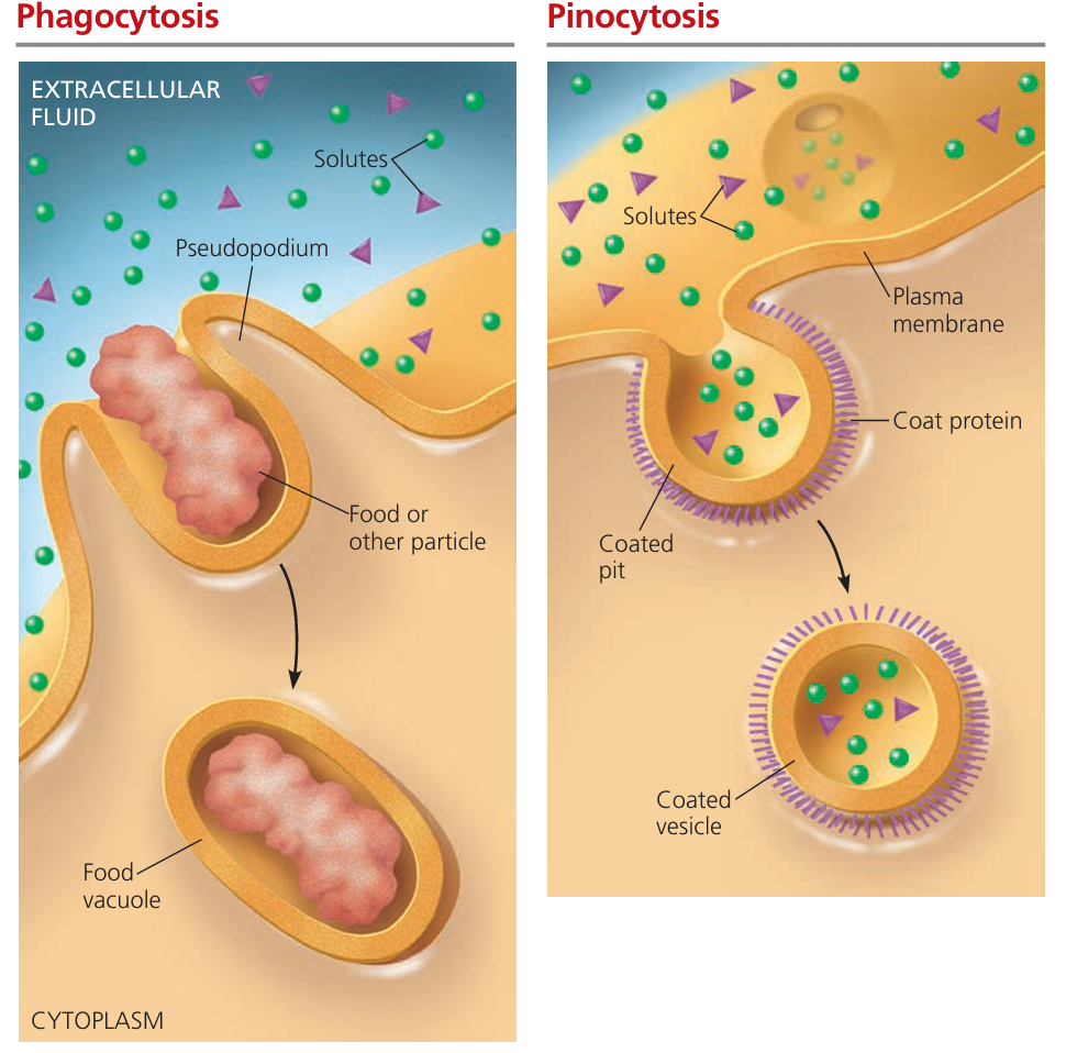 - Phagocytosis (“cell eating”): The cell engulfs solid particles like bacteria or debris.