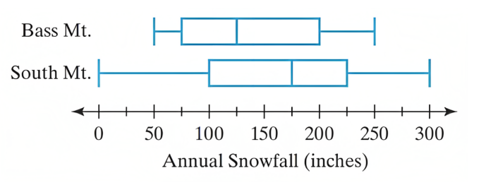 Note: The box plot shows Bass Mountain with median at 150 inches (Q1=100, Q3=200), and South Mountain with median at 100 inches (Q1=50, Q3=150). Whiskers extend to 50-250 inches for Bass Mountain and 0-200 inches for South Mountain.
