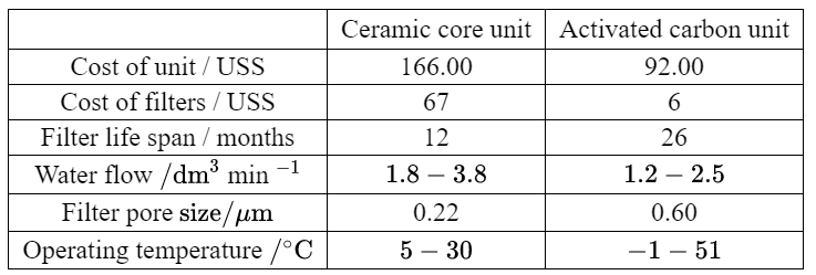 Kamal and Sandra have moved into a home in the USA that has a private water well. They need to purchase a filtration device to use in their home to make their water safe for drinking. They are choosing between a ceramic core unit and an activated carbon unit. The information for each unit is shown in the table below. An individual would typically use around \(2 \mathrm{dm}^3\) of water a day for drinking and cooking.