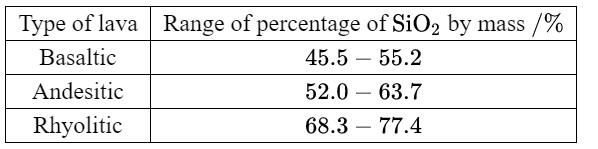 Three types of lava are basaltic, andesitic and rhyolitic. The \(\mathrm{SiO}_2\) content for each type of lava lies within the following ranges, all of them expressed in percentage by mass: