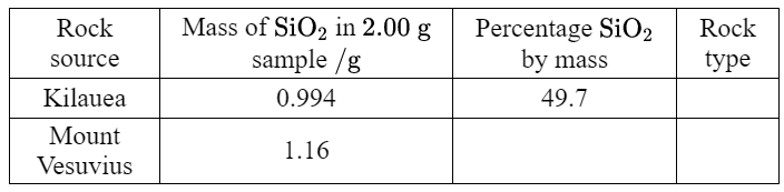 To determine the type of rock from Kilauea, we need to calculate the percentage of SiO2 by mass in the rock sample taken from Kilauea.