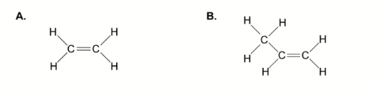 Molecule B is represented as , and it also has a double bond between two carbon atoms. Like molecule A, it is also an example of an alkene.