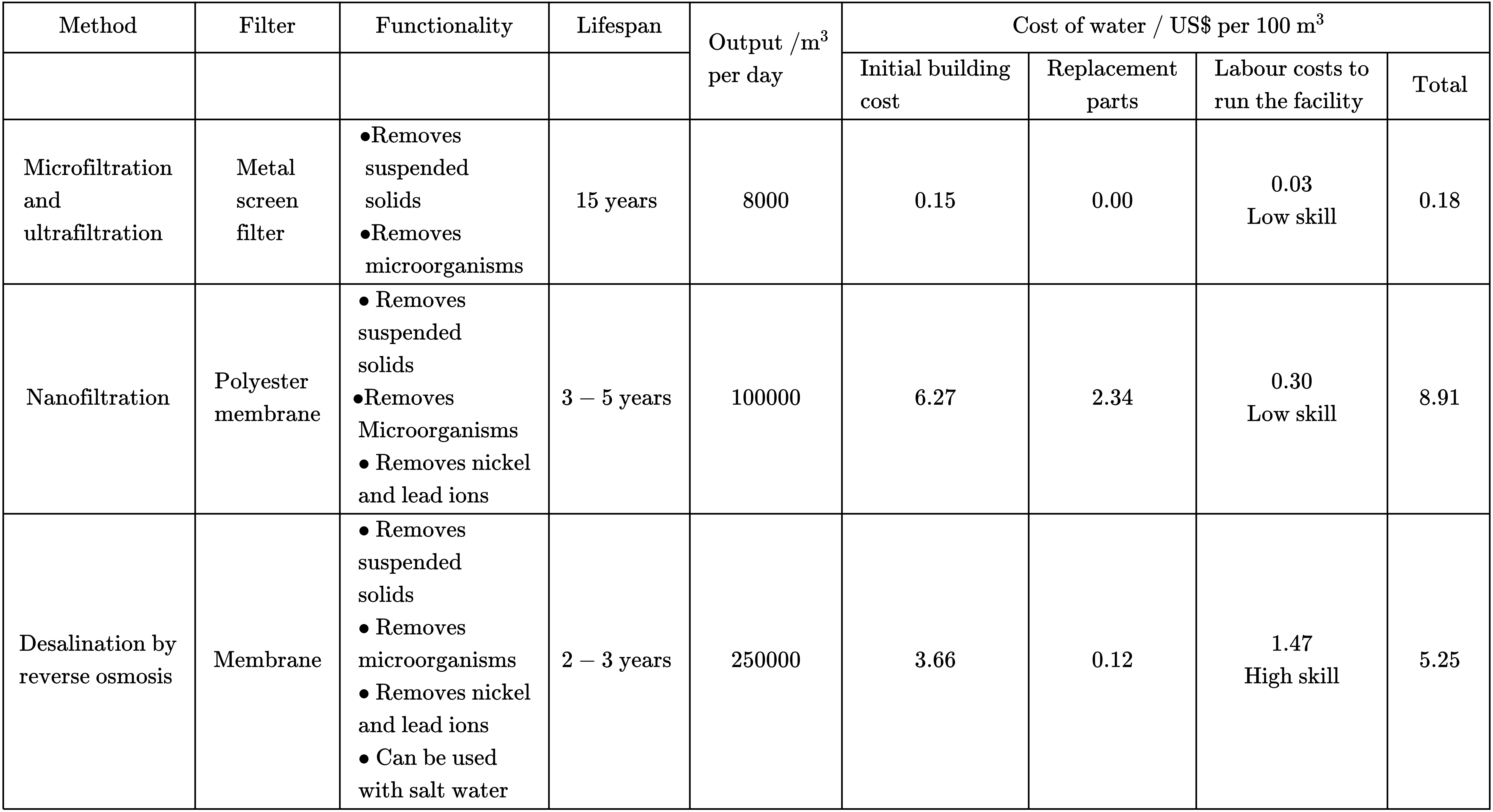 The table below shows some information about some different technologies used for water treatment. The volumes in this table are very large. For comparison, the volume of any Olympic-sized swimming pool is \(25000 \mathrm{~m}^3\).