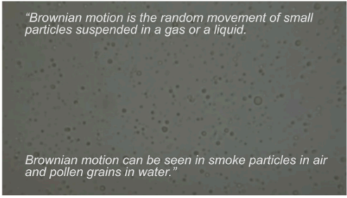 “Brownian motion is the random movement of small particles suspended in a gas or a liquid. Brownian motion can be seen in smoke particles in air and pollen grains in water.”