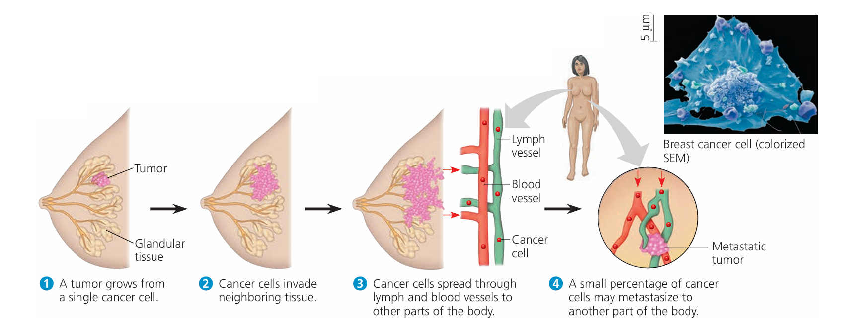 - Cancer cells don’t stop at forming tumors – some can invade nearby tissues. Others may enter the blood or lymph and spread to distant parts of the body (this is called metastasis).