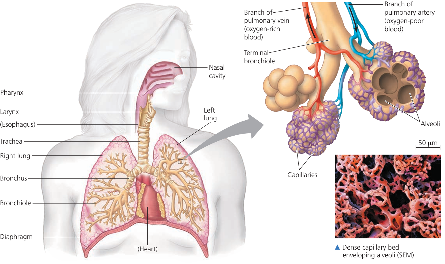- Alveoli: Thin, moist, large surface area, surrounded by capillaries