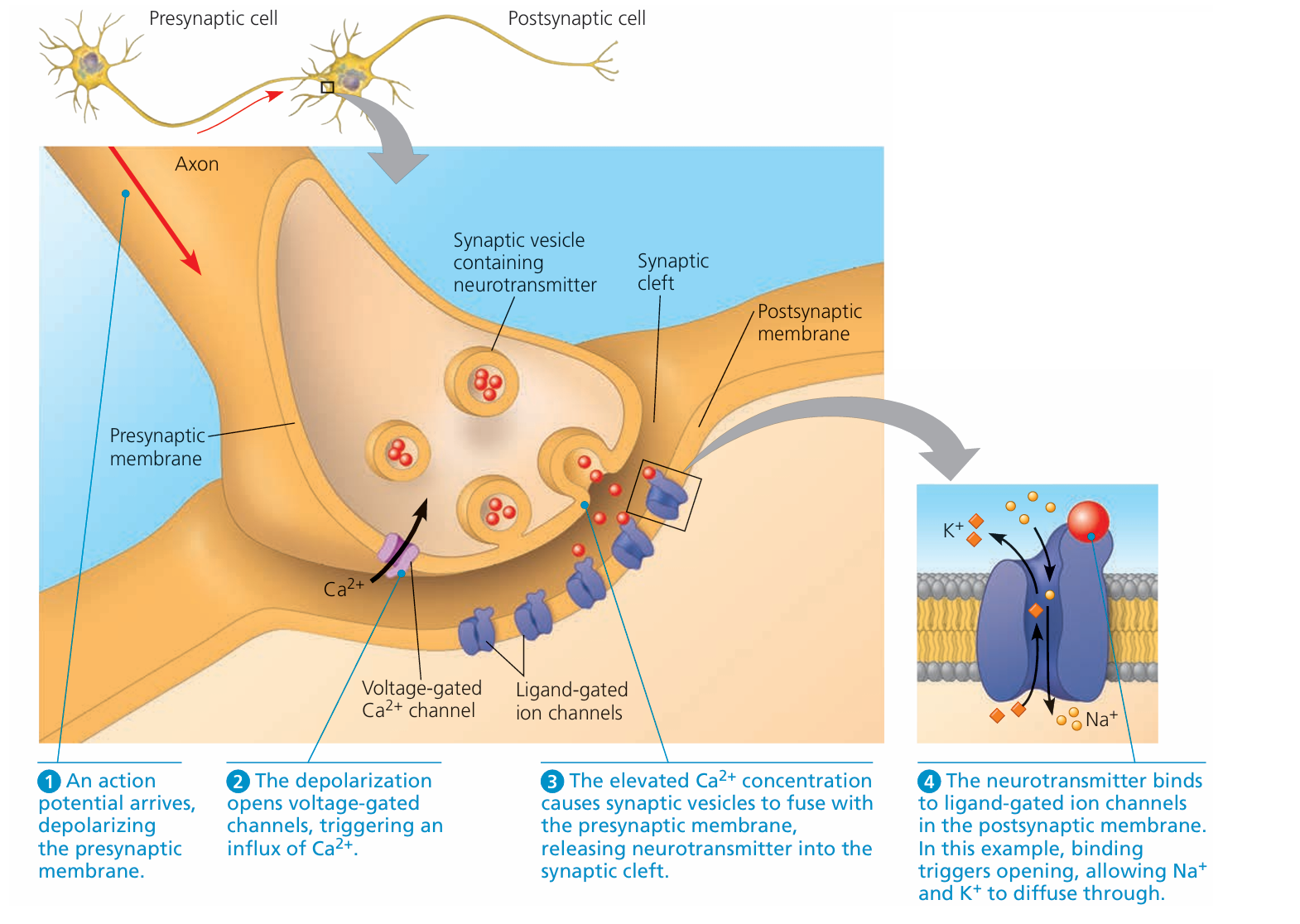 | Synapse | Gap between neurons; uses neurotransmitters for one-way signal |
