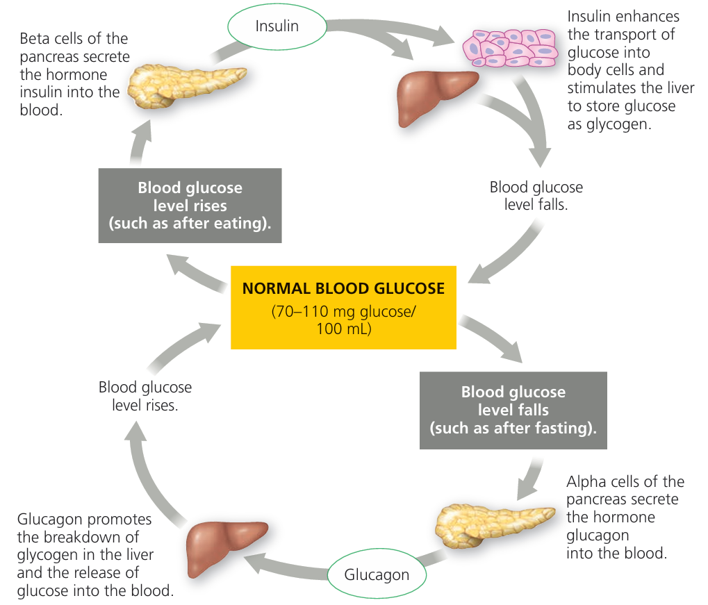 | Insulin | Blood sugar too high | Stimulates cells to absorb glucose + store in liver as glycogen |