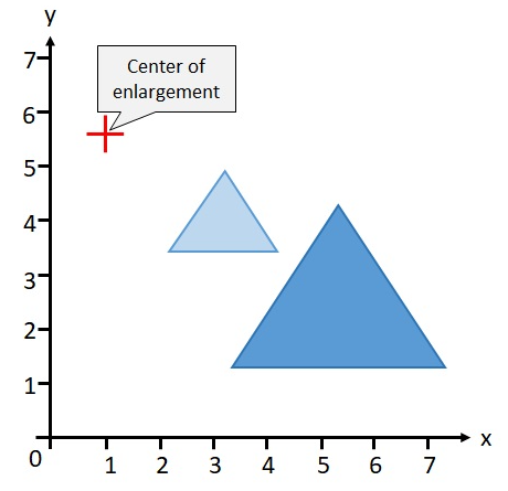Enlargement (or dilation) is a type of transformation that changes the size of a shape but keeps its shape and angles the same. The center of enlargement is a fixed point from which the figure is enlarged or reduced.