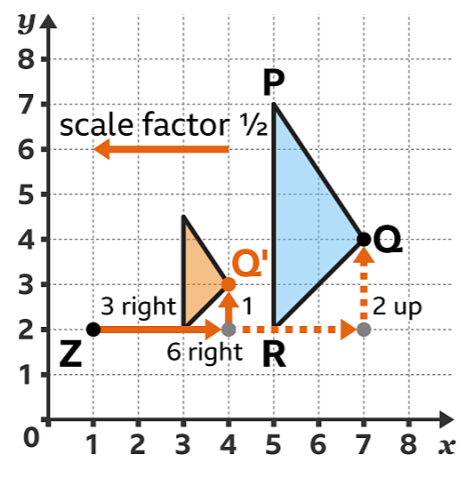 Vertex Q is 6 squares to the right and 2 squares above the center of enlargement (Z).