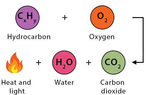 \( \mathrm{Fuel + O_2 \rightarrow CO_2 + H_2O + energy} \)