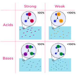 Strength refers to how completely a substance ionises in water.