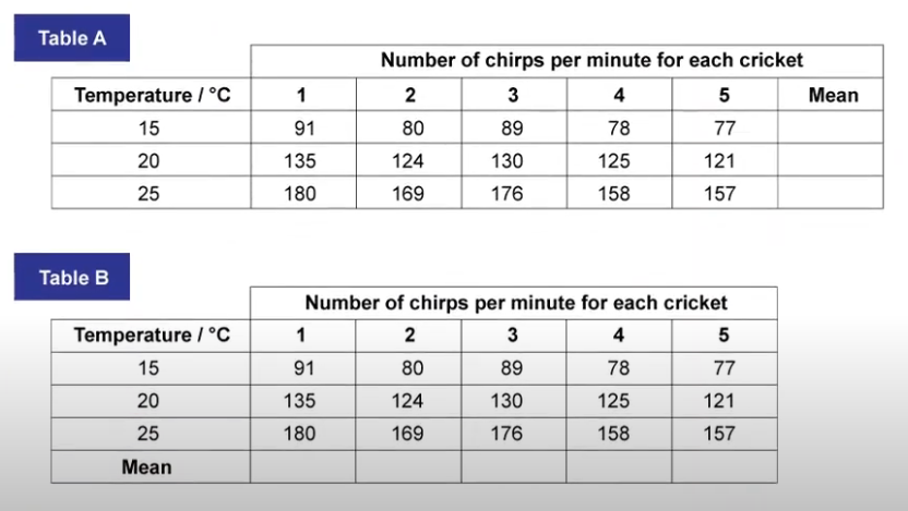 - Second Table: Averages per cricket across temps (e.g., Cricket A: 20/min) obscures temperature effect, less relevant.