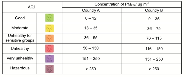 Pollutants in the air come from many different sources. Small particles are one type of pollutant. Particles smaller than 2.5 micrometres $(\mu \mathrm{m})$ known as $\mathrm{PM}_{2.5}$ are particularly dangerous as they are too small to see or feel but they can cause serious health problems. The Air Quality Index (AQI) scale is used by health authorities to inform people of the levels of $\mathrm{PM}_{2.5}$ in the air. The AQI relates air quality to concentration of particles in the air. Different countries, however, use different concentrations of $\mathrm{PM}_{2.5}$ for the scale.