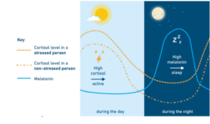 Markscheme Answer: “Increases melatonin levels to counteract high cortisol / Restores natural sleep-wake cycle”