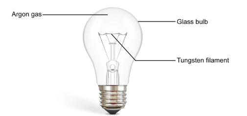 The diagram below shows an incandescent bulb. Incandescent light bulbs work when electricity passes through the filament and heats it. The filament is made out of tungsten (chemical symbol W) and is surrounded by argon (Ar) gas.
