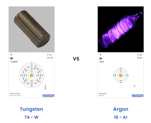 Describe two differences in the physical properties of tungsten and argon.