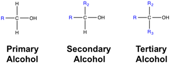 - Tertiary (3°) alcohol: –OH attached to a carbon bonded to three other carbons. Example: 2-Methylpropan-2-ol (\( \mathrm{(CH_3)_3COH} \))