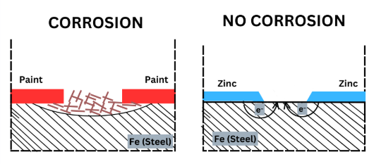 Final Answer: Zinc sacrifices itself (corrodes) to protect iron — a redox-based protection.