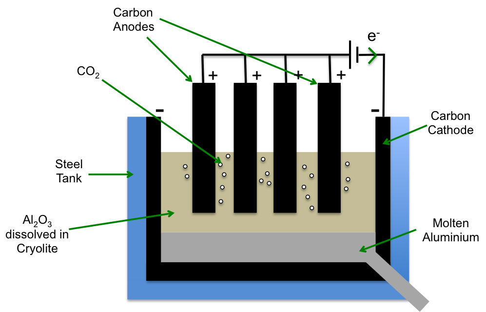 - Electrolyte: Molten Al₂O₃ dissolved in cryolite (Na₃AlF₆) to lower melting point.