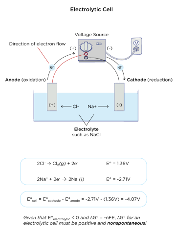 - Electrons are forced to flow from anode to cathode by an external battery.