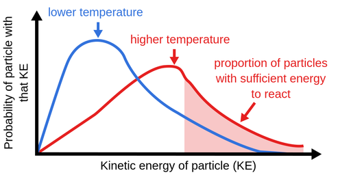 Final Answer: Temperature increases the proportion of molecules with enough energy to overcome \( \mathrm{E_a} \), making the reaction proceed faster.