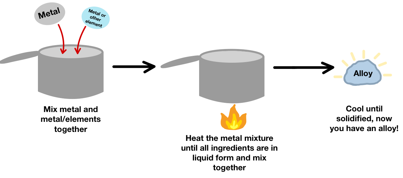 An alloy is a mixture of two or more elements, at least one of which is a metal, made to improve strength, hardness, or resistance to corrosion.