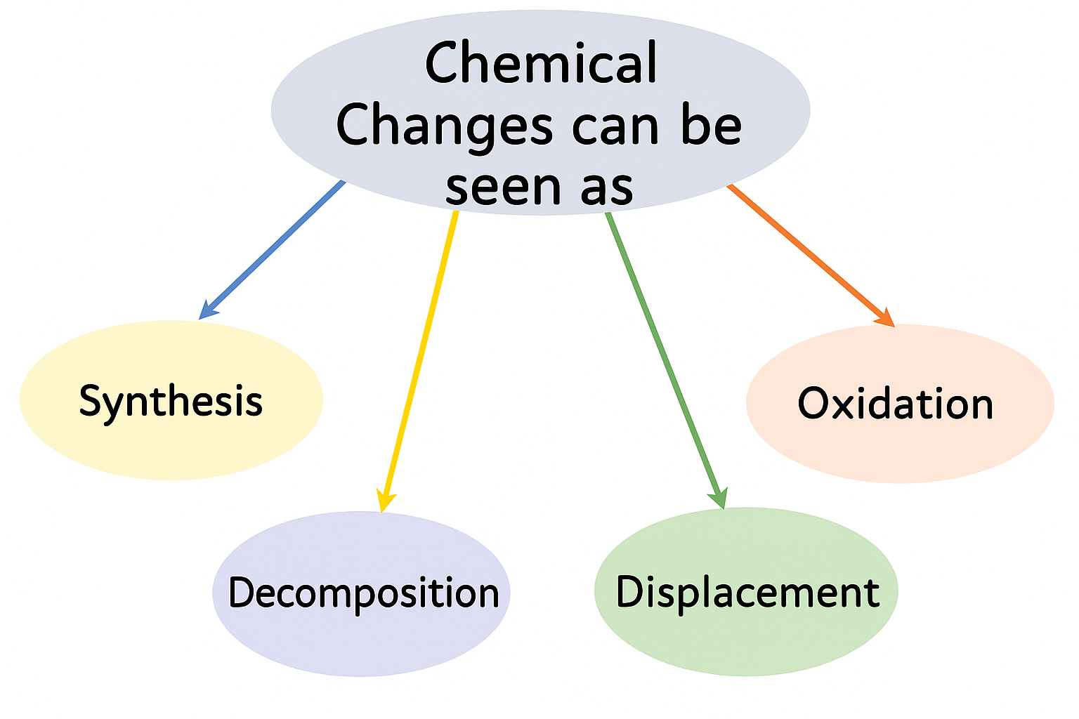 A chemical change (also called a chemical reaction) is a change in which one or more new substances are formed with different chemical properties and composition from the original substances.