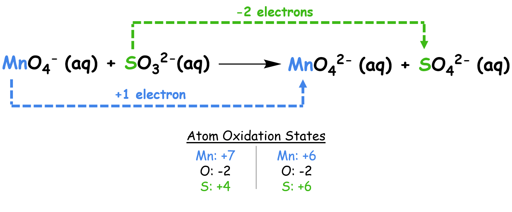 | 6. The sum of oxidation numbers in a polyatomic ion equals the ion’s charge. | \( \mathrm{SO_4^{2-}: S + 4(-2) = -2 \Rightarrow S = +6} \) |
