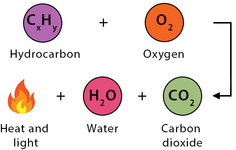 General form: \( \mathrm{Fuel + O_2 \rightarrow CO_2 + H_2O + Energy} \)