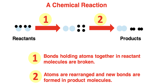 A chemical reaction is a process in which one or more substances (reactants) are converted into new substances (products) with different chemical properties. During a chemical reaction, the bonds between atoms are broken in the reactants and new bonds are formed in the products.