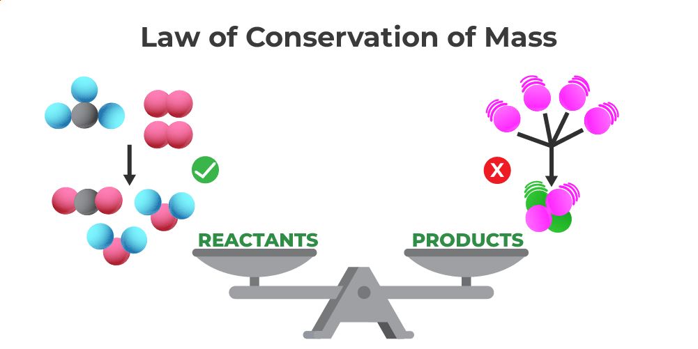Example: When hydrogen reacts with oxygen to form water, the total mass before and after remains the same: