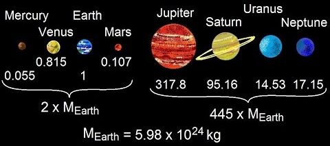 - Jupiter: Largest planet, mass about \( 1.9 \times 10^{27} \, \text{kg} \), over 300 times Earth’s mass.
