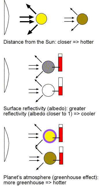The surface temperature of a planet or star depends mainly on its distance from the Sun and atmospheric conditions.