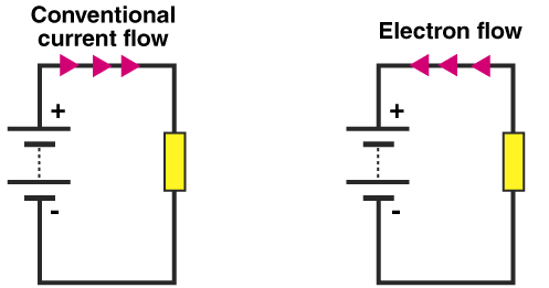 - It flows from the positive terminal of the power source to the negative terminal (conventional current direction).