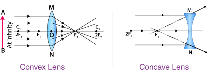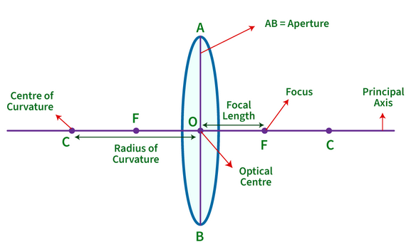 - Principal Focus (F): The point where parallel rays of light either converge (convex lens) or appear to diverge from (concave lens).