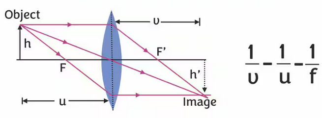 where \(f\) = focal length, \(v\) = image distance, \(u\) = object distance (sign convention applied).