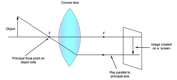 - A ray parallel to the principal axis passes through the focal point after refraction.