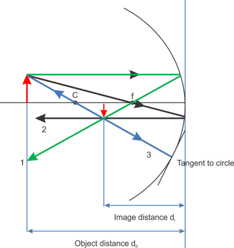 - Object beyond center of curvature (\(C\)): Real, inverted, diminished image between \(C\) and focus (\(F\)).
