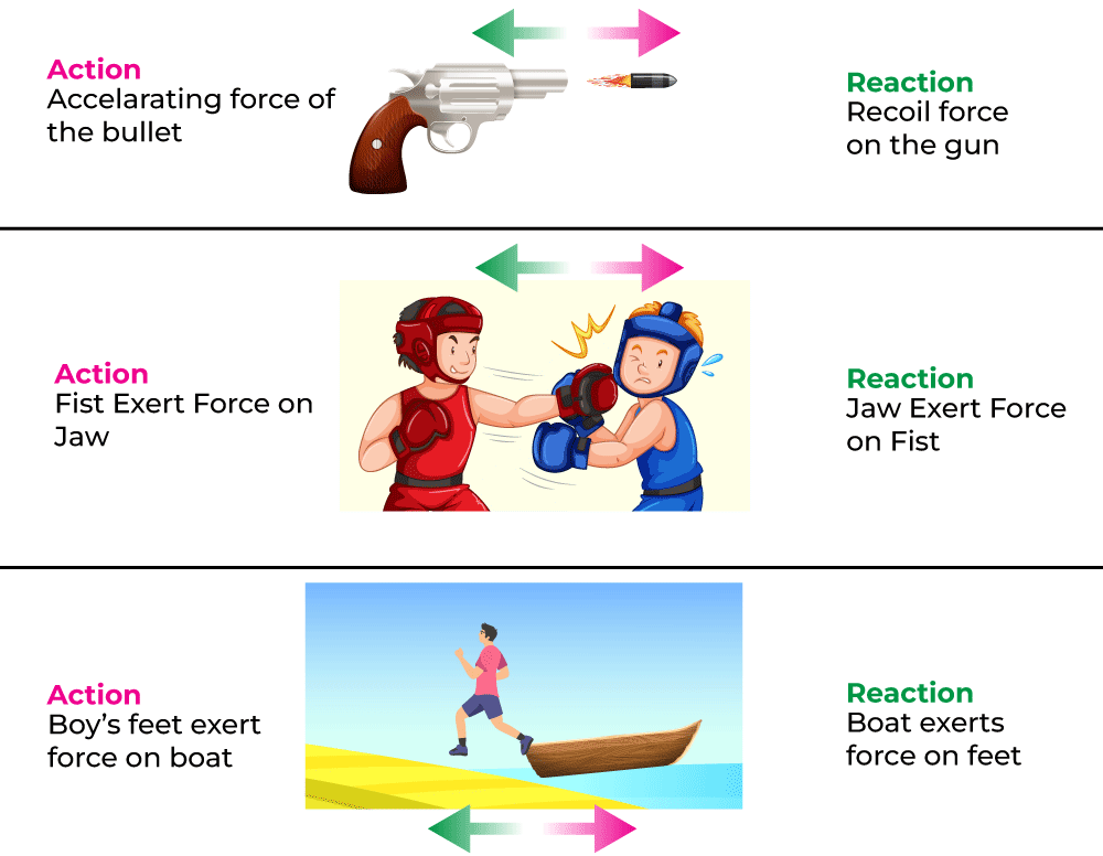Your feet push the boat backward (action), and the boat pushes you forward (reaction). The two forces are equal and opposite.