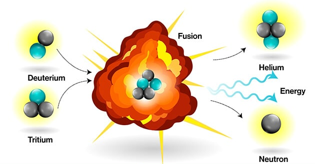 Example reaction: \( ^{2}\text{H} + ^{3}\text{H} \;\;\rightarrow \;\; ^{4}\text{He} + ^{1}\text{n} + \text{Energy} \)