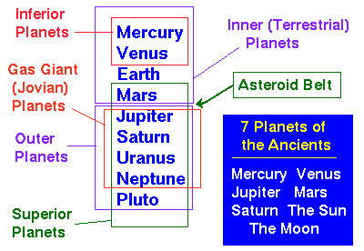 Outer planets (gas giants): Jupiter, Saturn, Uranus, Neptune