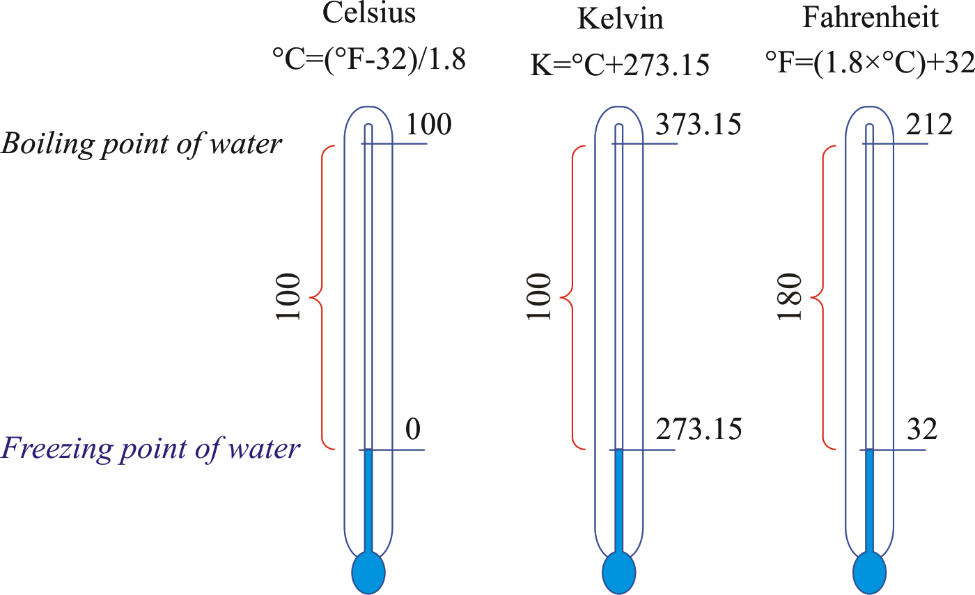 - Celsius scale (°C): Based on freezing point (0°C) and boiling point (100°C) of water at 1 atm pressure.