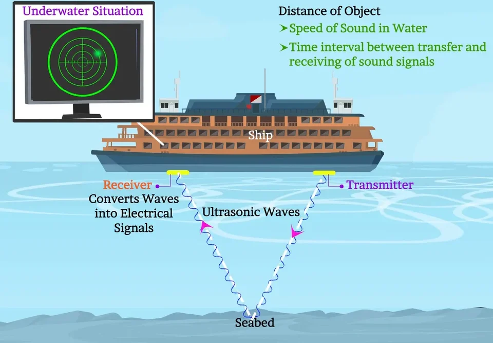 - Ships and submarines send ultrasound pulses into water → measure the time taken for echo to return → calculate depth or detect obstacles.