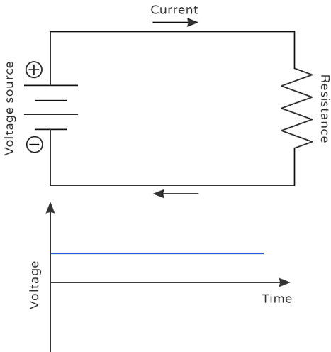 - Voltage is constant (does not change with time).