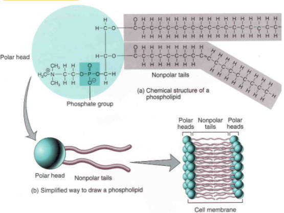 | Phosphate head | Hydrophilic | Faces water (cytoplasm & ECF) |